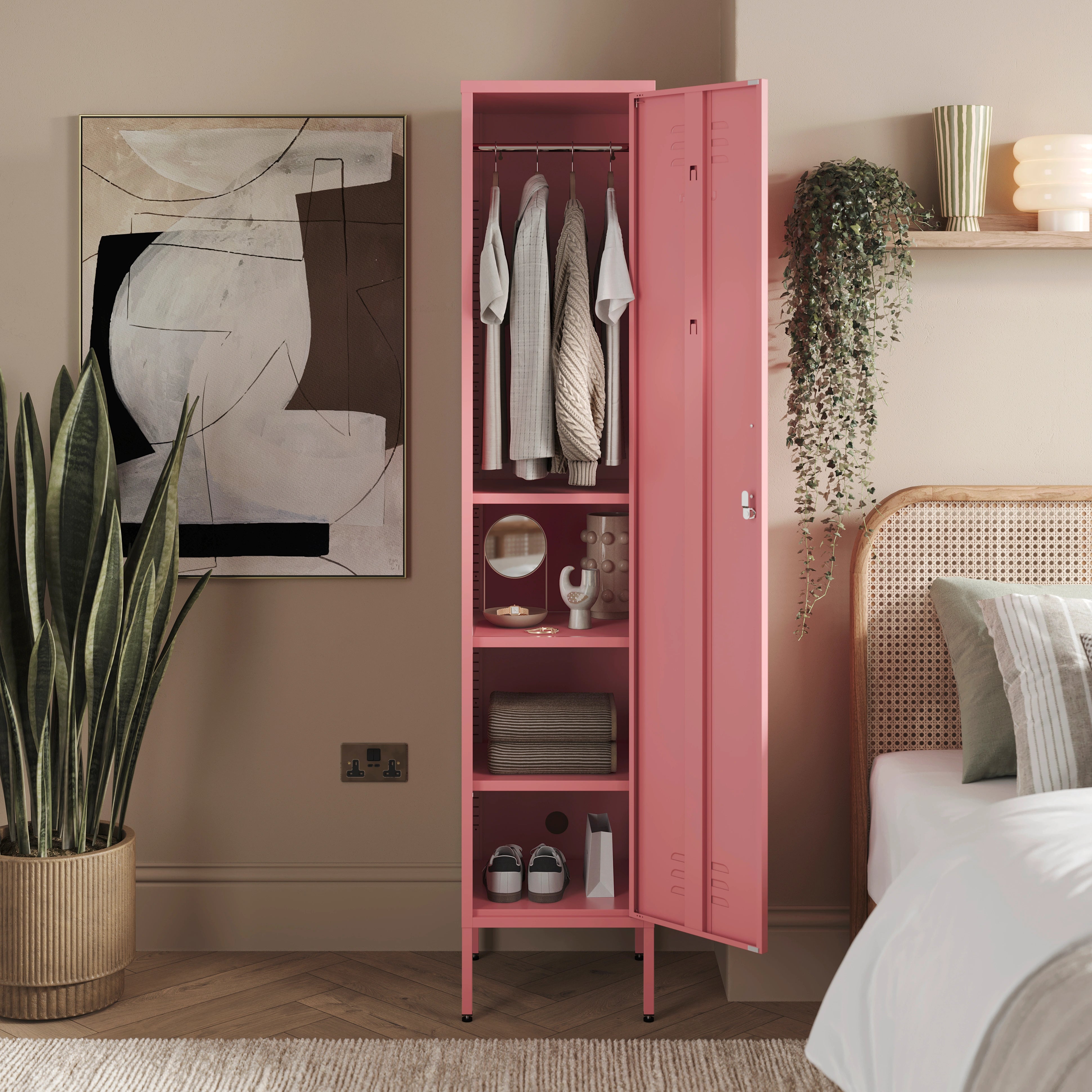 Haal het maximale uit elke centimeter ruimte met de Flamingo Bexley; een lange, slanke opbergkast Ontworpen om zelfs de kleinste ruimtes een vleugje kleur te geven. Met zijn magnetische oppervlak en volledig verstelbare planken is deze Bexley locker perfect om een vleugje kleur toe te voegen aan slaapkamers, gangen of waar je ook maar extra opbergruimte nodig hebt. De Flamingo-afwerking geeft een vleugje persoonlijkheid en helpt je georganiseerd te blijven. Of je nu boeken, accessoires of dagelijkse benodigdheden opbergt, de Flamingo Bexley is zowel mooi als praktisch. Bovendien zit hij boordevol extra functies zoals een magnetisch oppervlak, handige haken, gaten voor wandmontage en verstelbare pootjes.