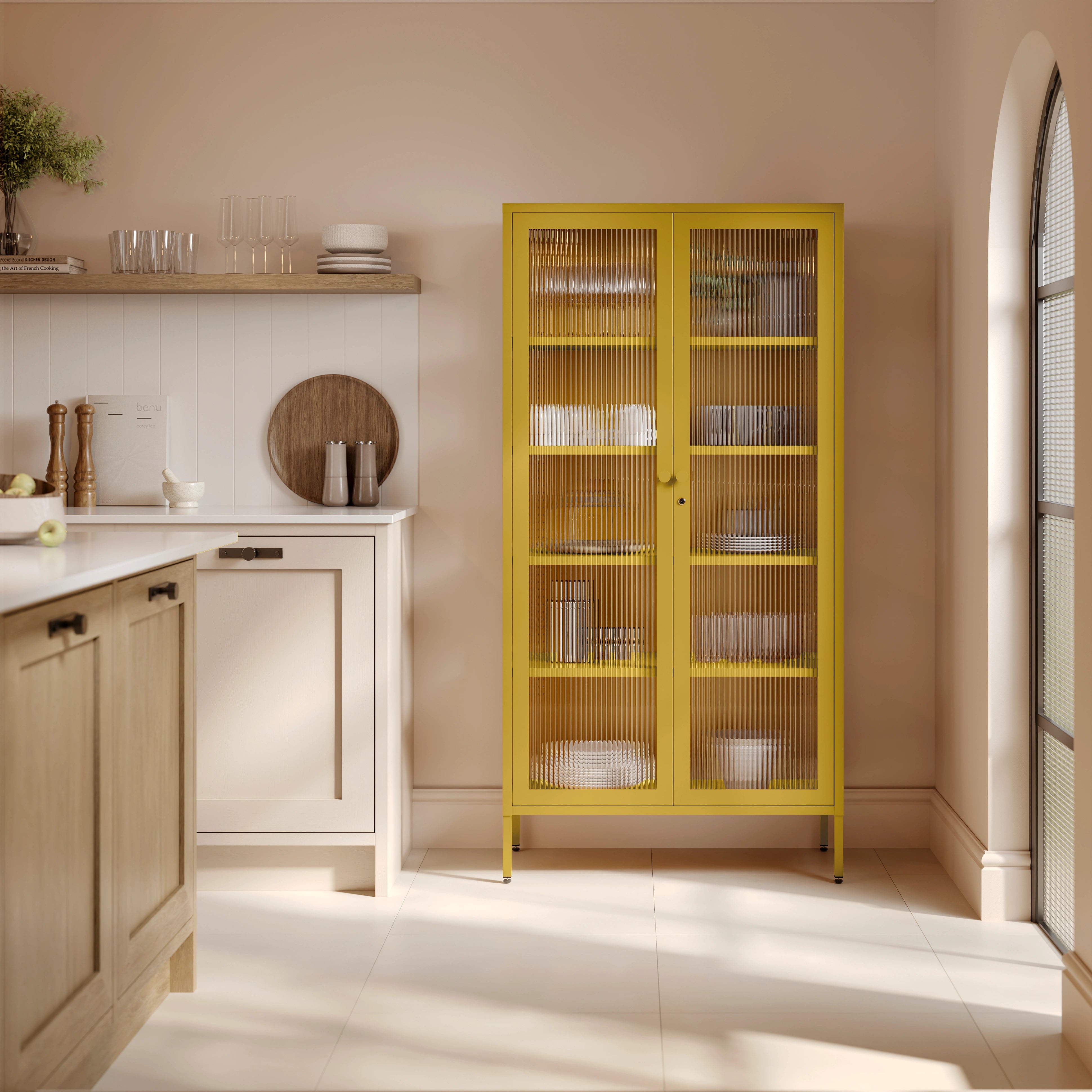 Inside, you'll find four shelves adjustable every 20mm plus the base, giving you the flexibility to configure your storage exactly as you need it. Add extra utility, while door air vents keep things fresh. The details are considered throughout, with fluted glass panels set in a powder-coated metal frame, an stylish round door handle, a lock and key with a colour-matched keyring, adjustable rubber feet for a level finish, and wall mounting attachment points for added stability.
