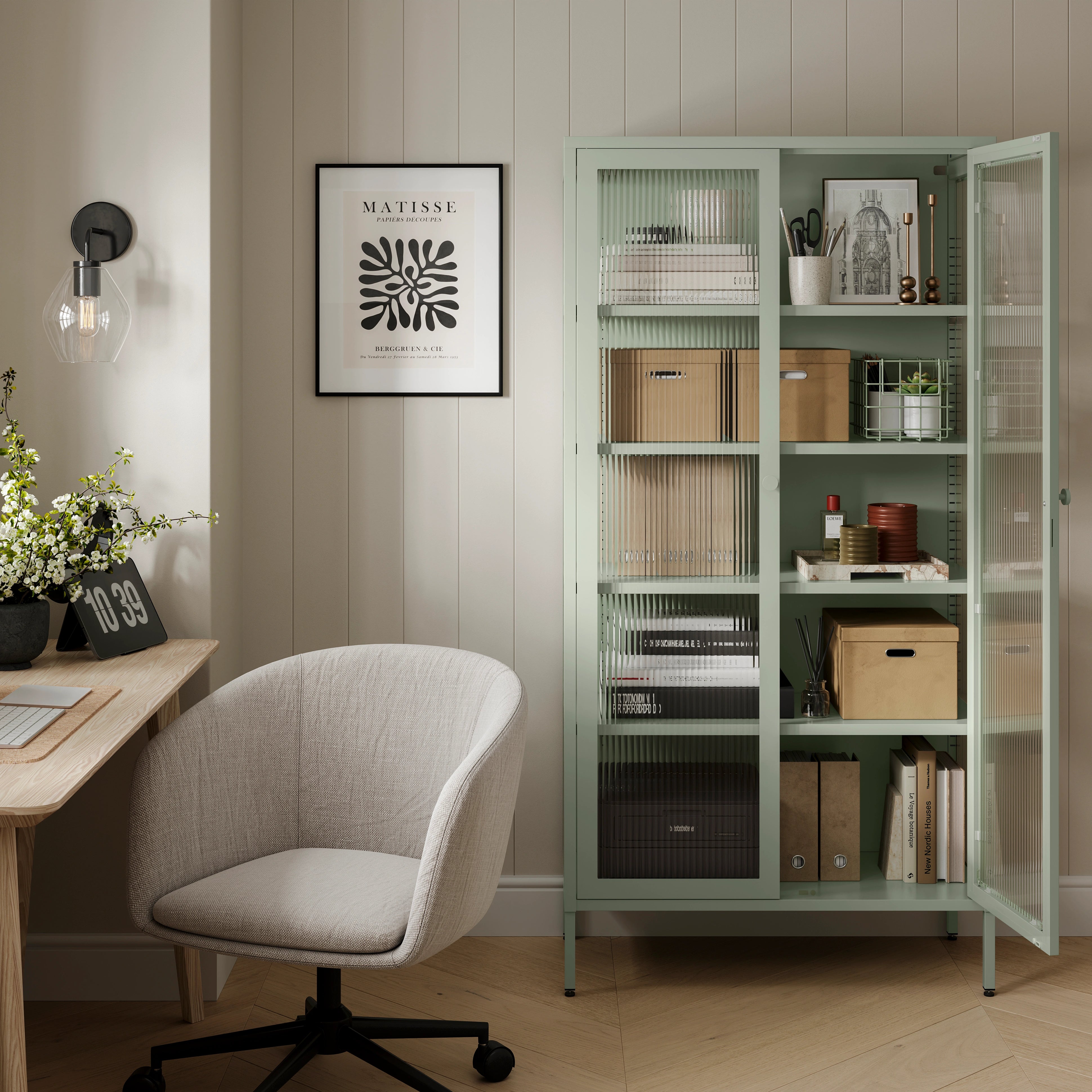 Inside, you'll find four shelves adjustable every 20mm plus the base, giving you the flexibility to configure your storage exactly as you need it. Add extra utility, while door air vents keep things fresh. The details are considered throughout, with fluted glass panels set in a powder-coated metal frame, an stylish round door handle, a lock and key with a colour-matched keyring, adjustable rubber feet for a level finish, and wall mounting attachment points for added stability.