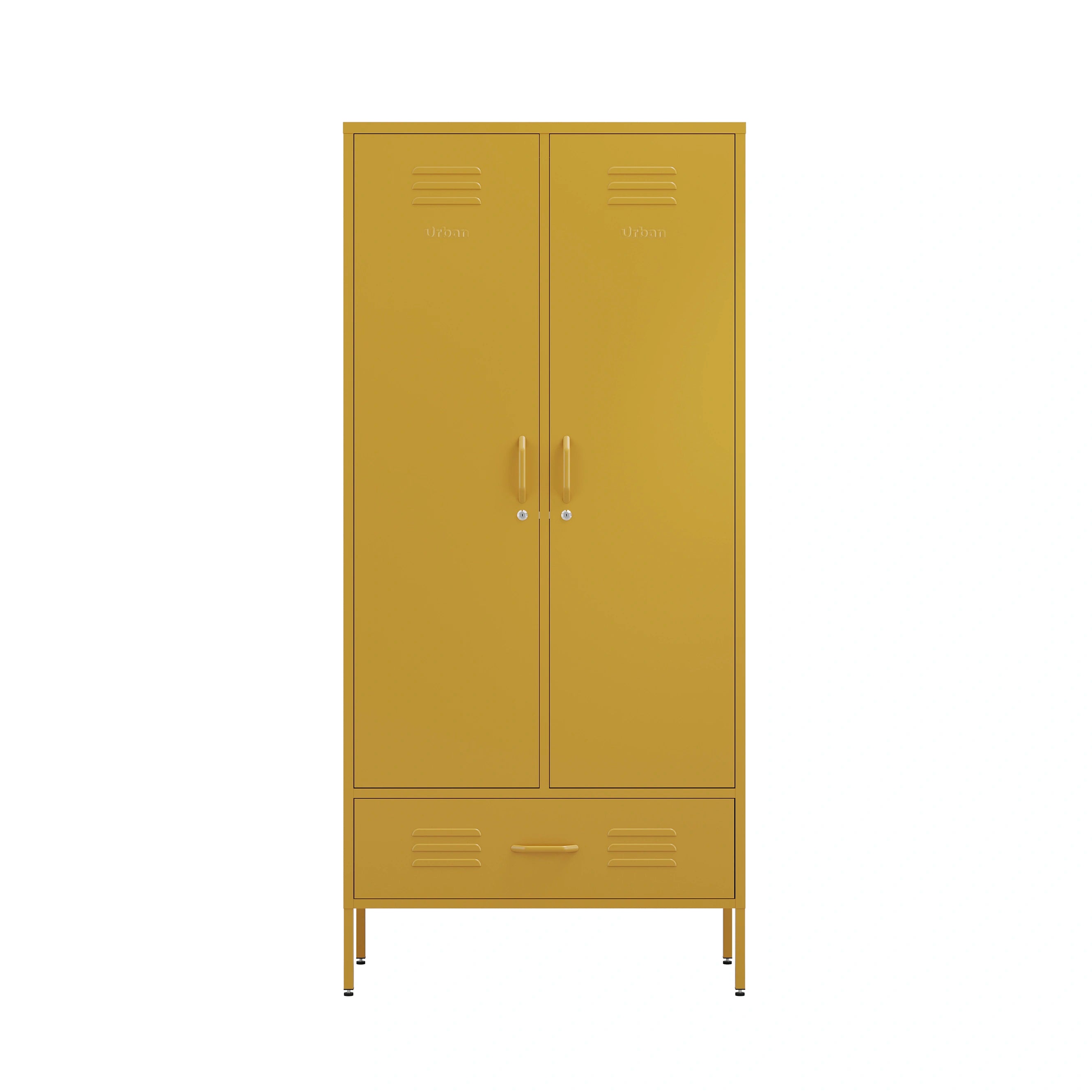 Metal, tall, double-door and single-drawer storage locker in mustard yellow, in a bedroom
